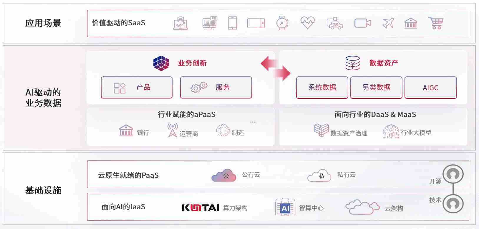 在基础设施层面,,,,基于商业或开源的云原生就绪开发工具与技术组件(PaaS)和面向AI的底层公共基础设施资源(IaaS),,,将共同支撑企业完成数字化转型
